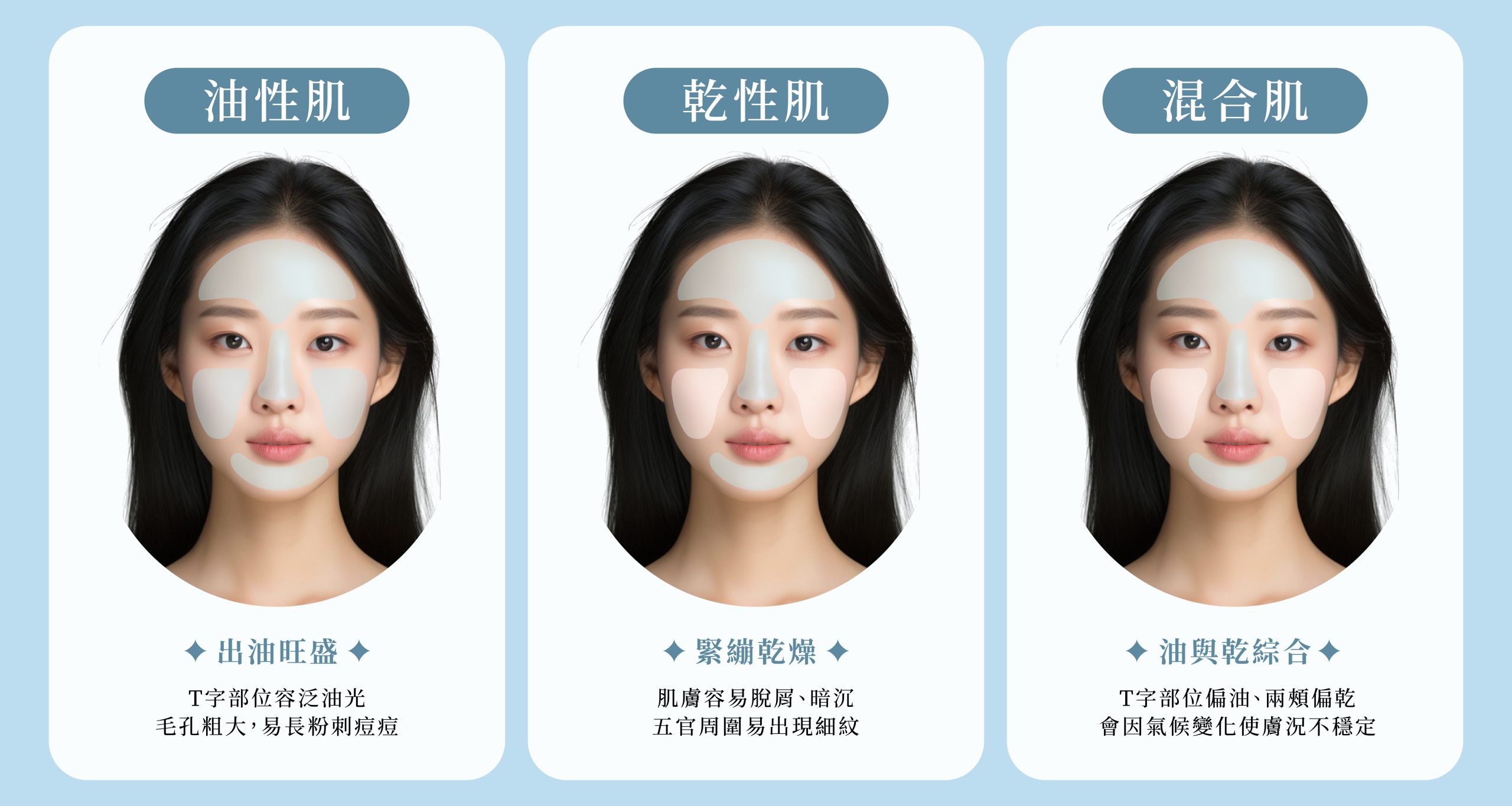 - 混合性肌膚:可針對不同部位調整清潔與保養強度,幫助油水平衡。