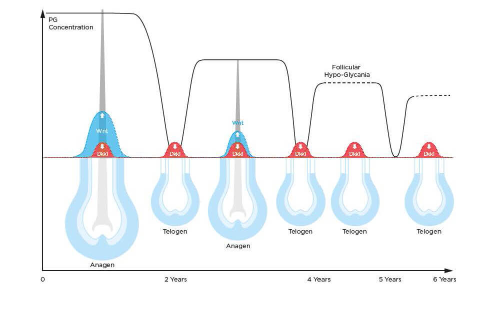 當人體受到龐大壓力、荷爾蒙波動(如產後、更年期)、營養不良、年齡增長或遺傳影響時,毛囊內的關鍵訊號分子——蛋白聚醣(Proteoglycans)會大量流失。