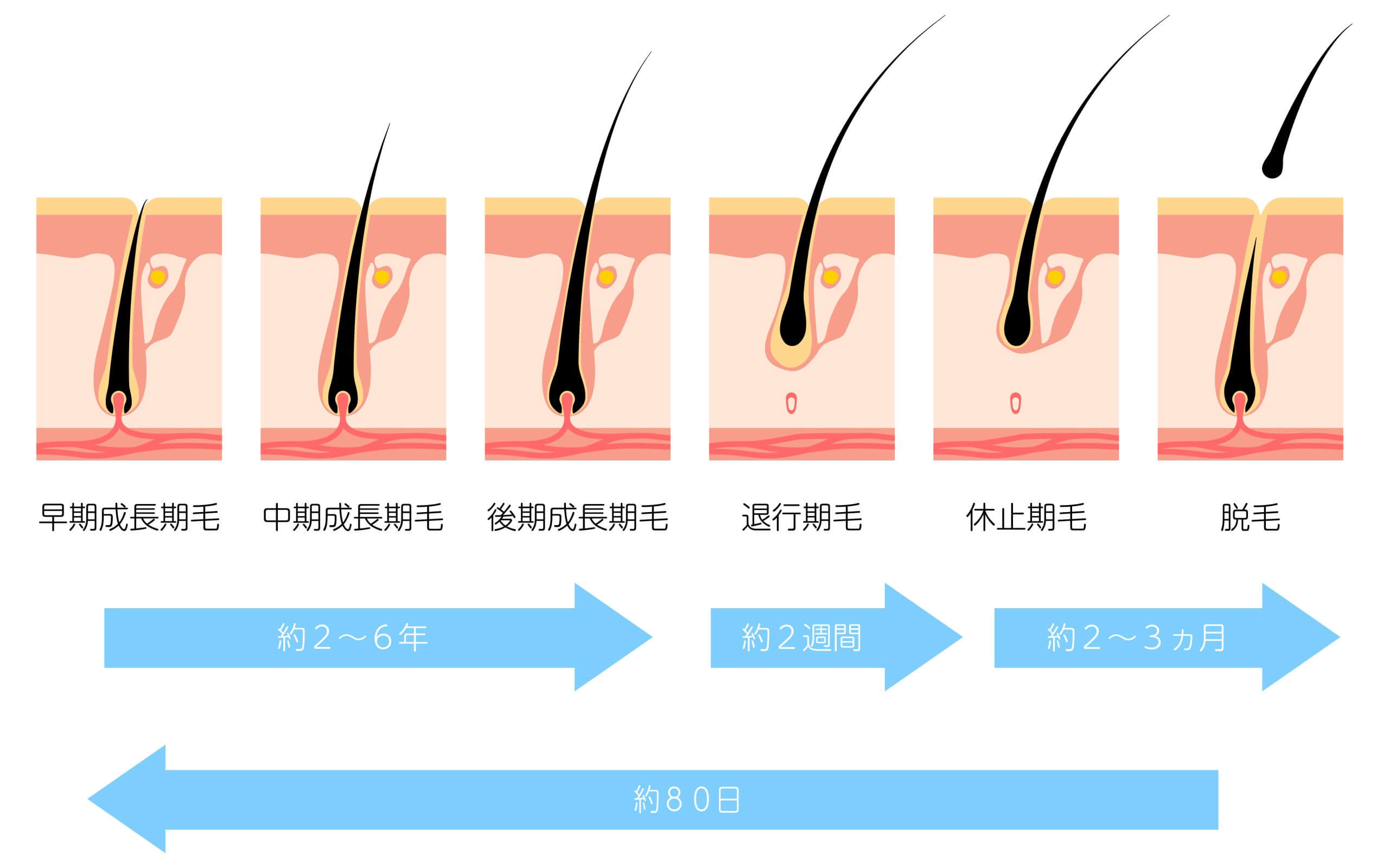 - 衰退期 (Catagen):生長停止,毛囊開始縮小,為期約 1-2 週。