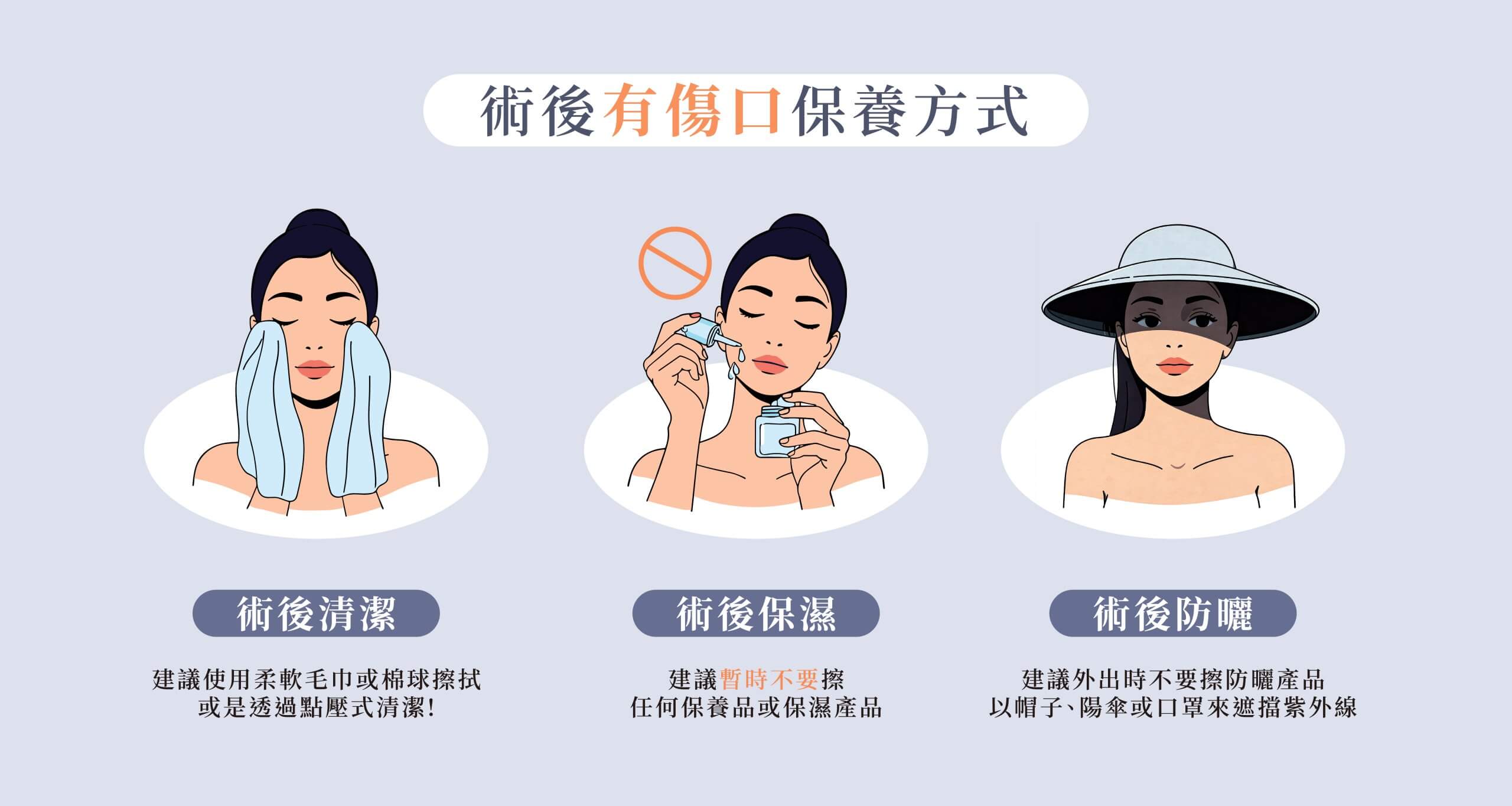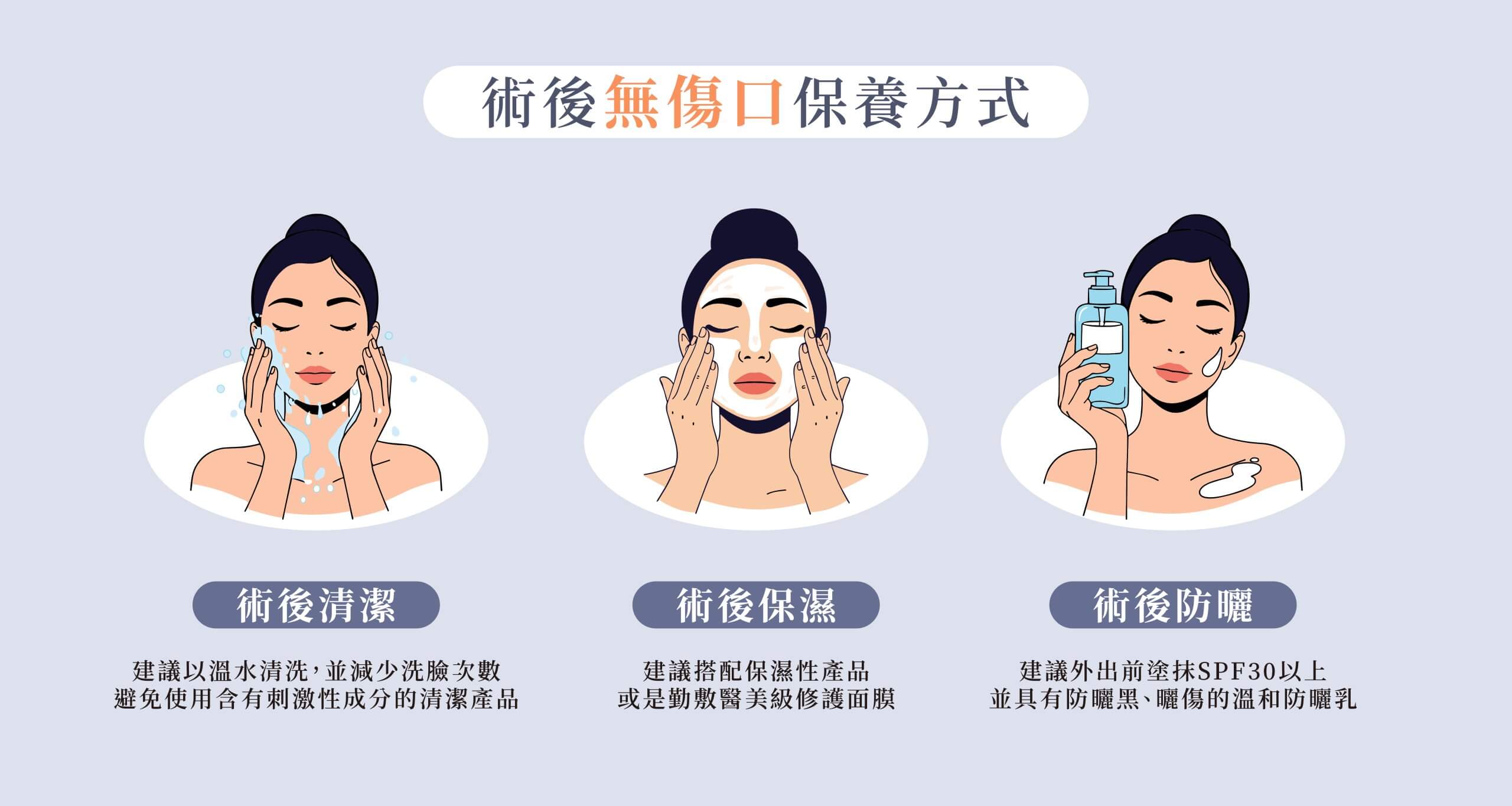 | 有明顯傷口 | 埋線、填充注射、整形手術、飛梭雷射、微針 | 存在開放性創口、可能有滲出液、易感染 | 無菌清潔、防水、物理防曬 |