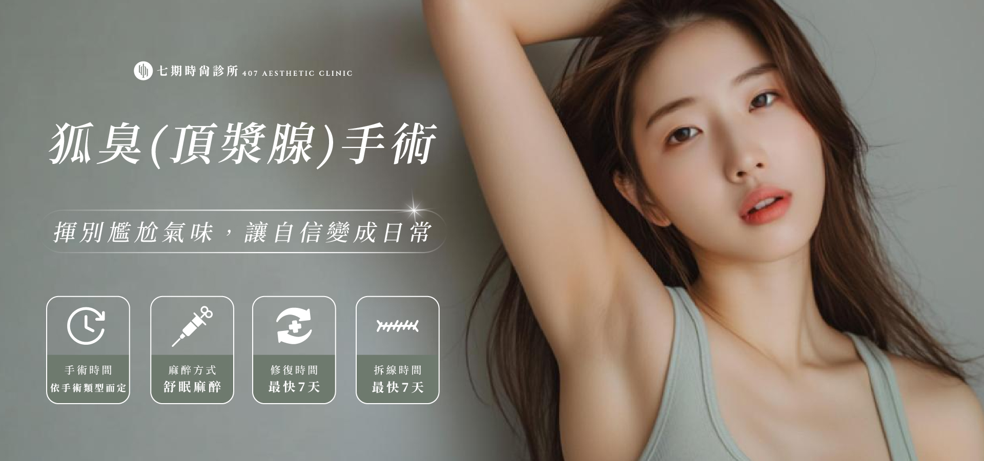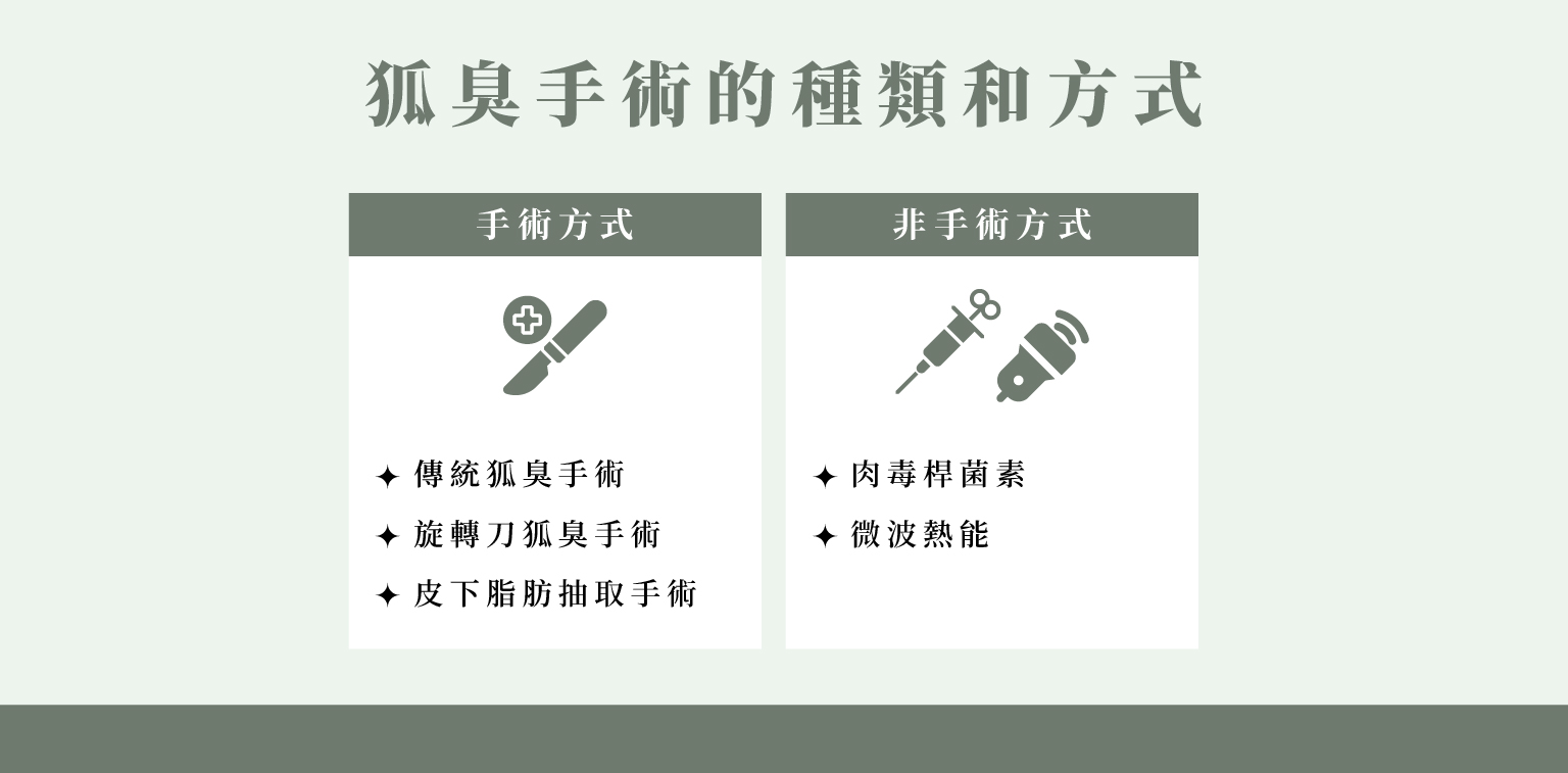 除手術外,也能透過肉毒桿菌抑汗、微波熱能等非手術療程改善狐臭;但這些方法通常效果較短期,且不見得適合所有人。建議透過專業醫師評估後,再選擇最適合自己的治療方式,才能獲得最理想的改善效果。