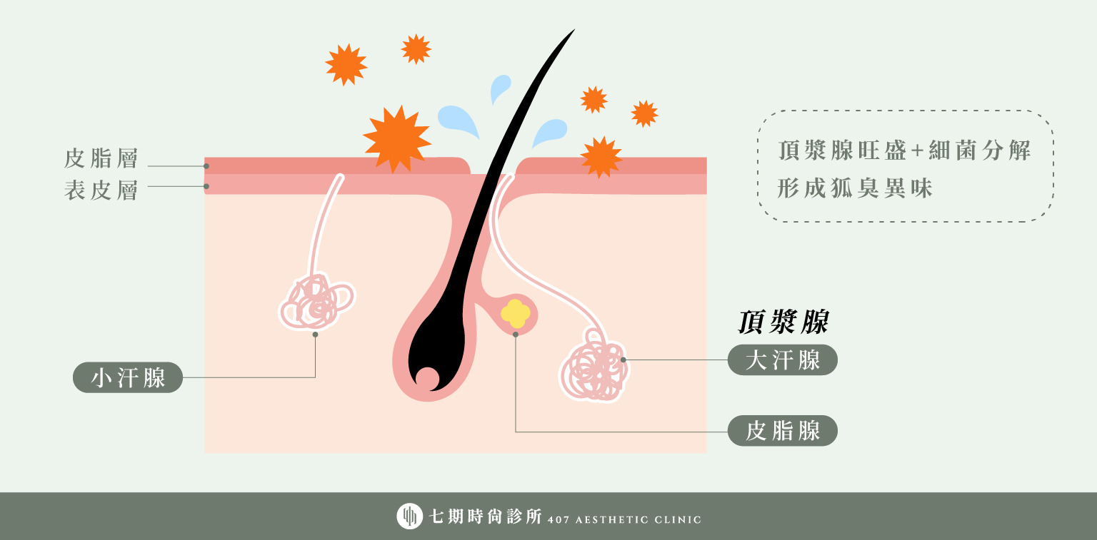 A:狐臭源自大汗腺(頂漿腺)。當其分泌物被皮膚表面的細菌分解後,會產生明顯且刺鼻的特殊氣味,最常見於腋下,也可能出現在乳暈、會陰部。