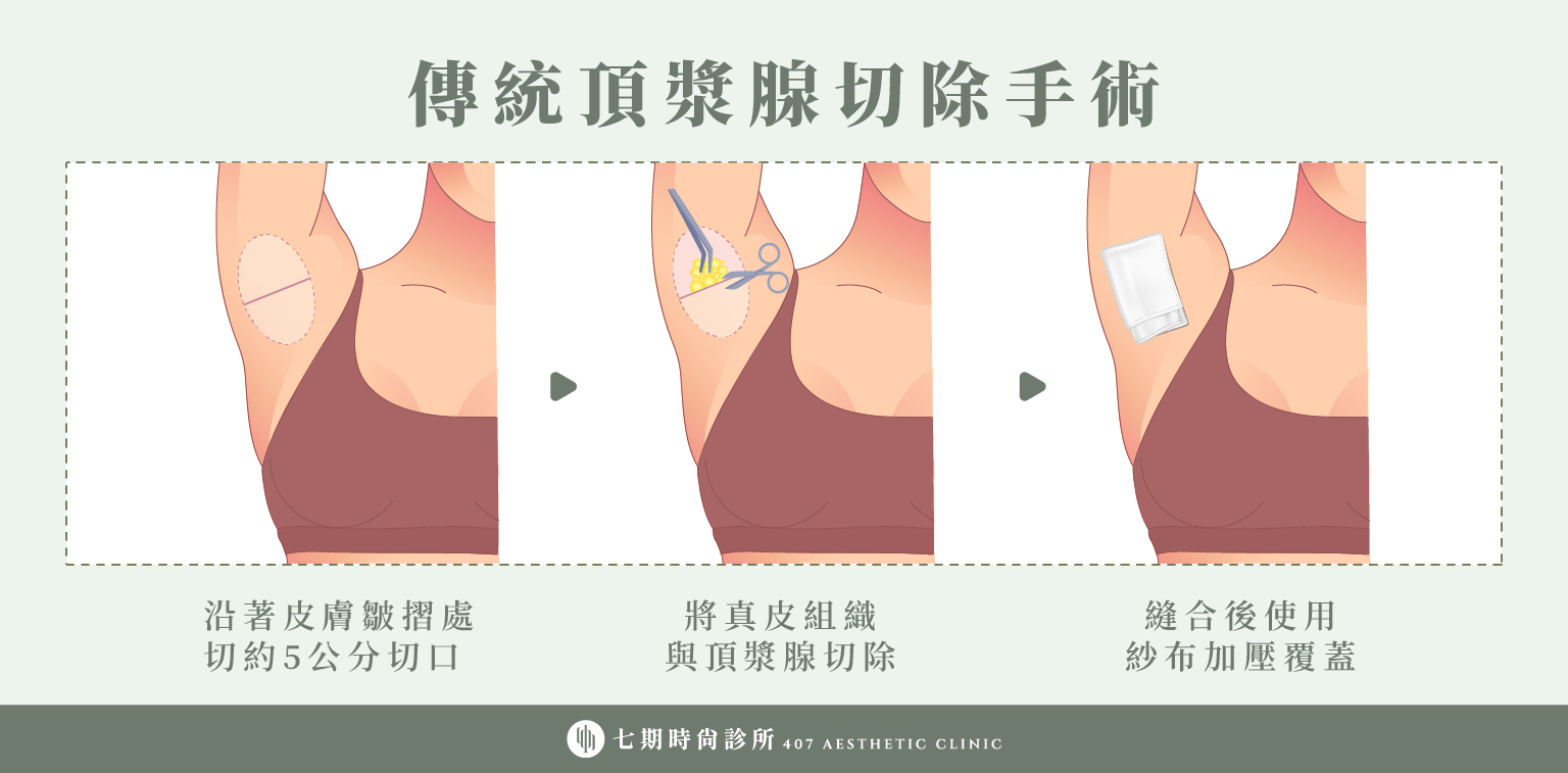 傳統狐臭手術是最早期、也是最直接的頂漿腺移除方式。醫師會於腋下做出較長的切口,將皮膚翻開後,切除肉眼可見的大部分或全部頂漿腺組織。整體手術時間通常約 60~90 分鐘。