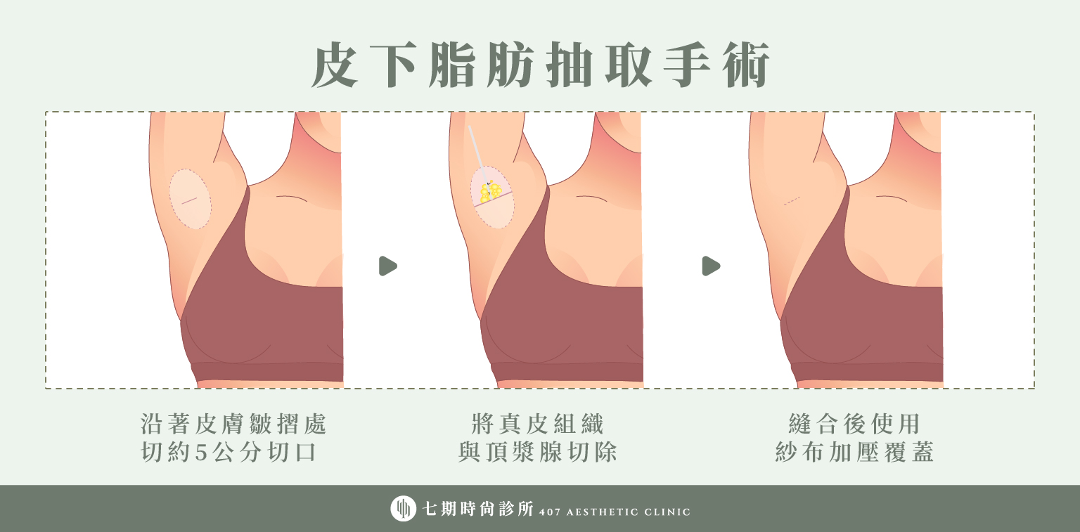 皮下脂肪抽取手術是以「抽脂原理」進行的狐臭治療方式。醫師會從腋下做一個小切口,將細小的抽脂導管伸入皮下,試圖將附著於局部脂肪層的頂漿腺一併吸除。