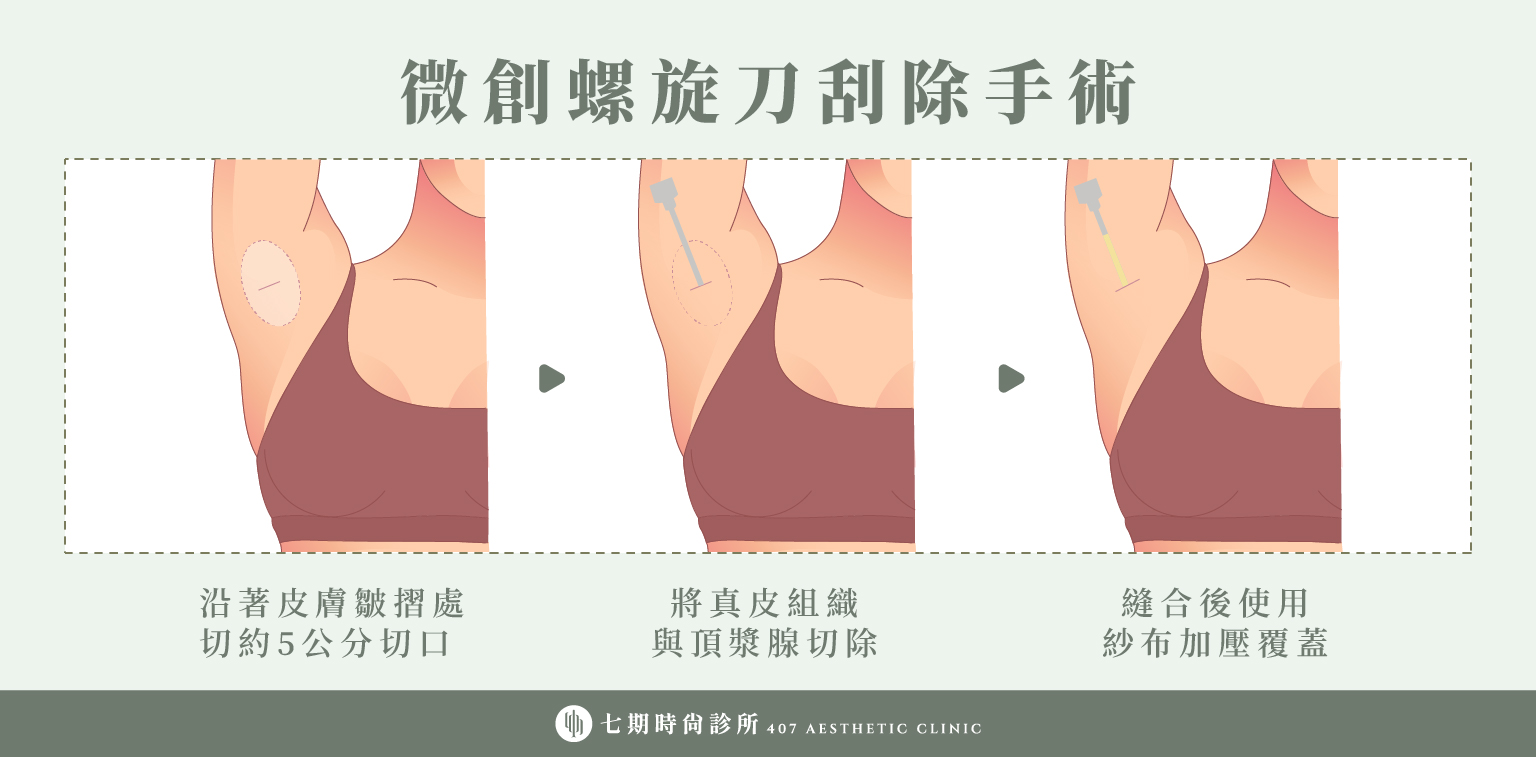 旋轉刀狐臭手術,也稱為 螺旋刀刮除法,是利用特殊的旋轉刀具,透過高速旋轉的方式分離附著在皮下脂肪層的頂漿腺,接著再以導管吸除被刮落的腺體。完整操作流程通常需 40~60 分鐘。