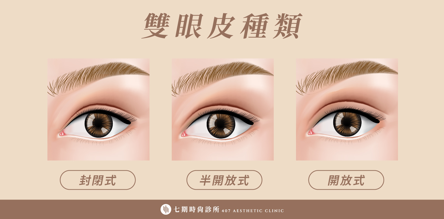 半開放式雙眼皮結合了封閉式與開放式雙眼皮的優點。其特徵是雙眼皮摺痕與眼頭不相連,線條由眼頭至眼尾漸寬,與眼皮上緣呈現微微的弧度差。這樣的設計能在保留自然柔和感的同時,達到視覺上拉近眼距、放大眼神的效果,使整體眼型更立體有神又不失柔美。
