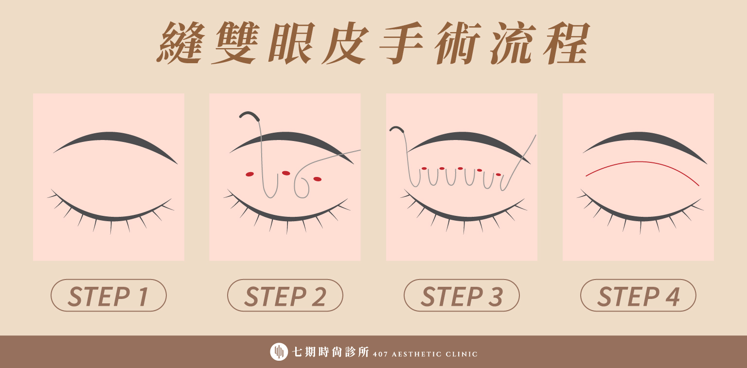 | 原理與特色 | 利用不可吸收縫線將眼皮與眼瞼板縫合,採「三點式」縫法,三個縫點間距固定,使雙眼皮摺痕深度一致 | 結合縫+割小切口技術,可微調提眼肌、眼皮及脂肪;縫點距眼尾至眼頭漸寬,摺痕自然,縫線牢固 | 上眼瞼頭尾或中間劃 1–2 公分切口,可移除部分脂肪,縫線固定,摺痕深度漸層自然 |