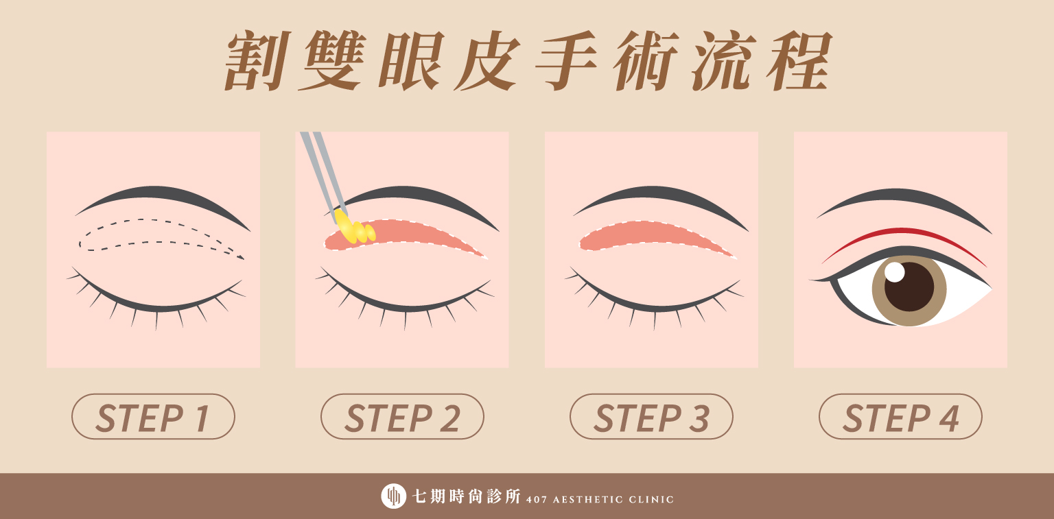 割雙眼皮手術是在上眼瞼預定形成雙眼皮的位置,劃出約 2–3 公分的切口,去除多餘皮膚與脂肪後,仔細分離提眼瞼肌,並將眼皮折入切口內。最後使用不可吸收縫線將提眼瞼肌與眼皮固定,依靠皮膚縫合後的自然沾黏,在下方軟組織形成摺痕,進而塑造出明顯且持久的雙眼皮皺褶。