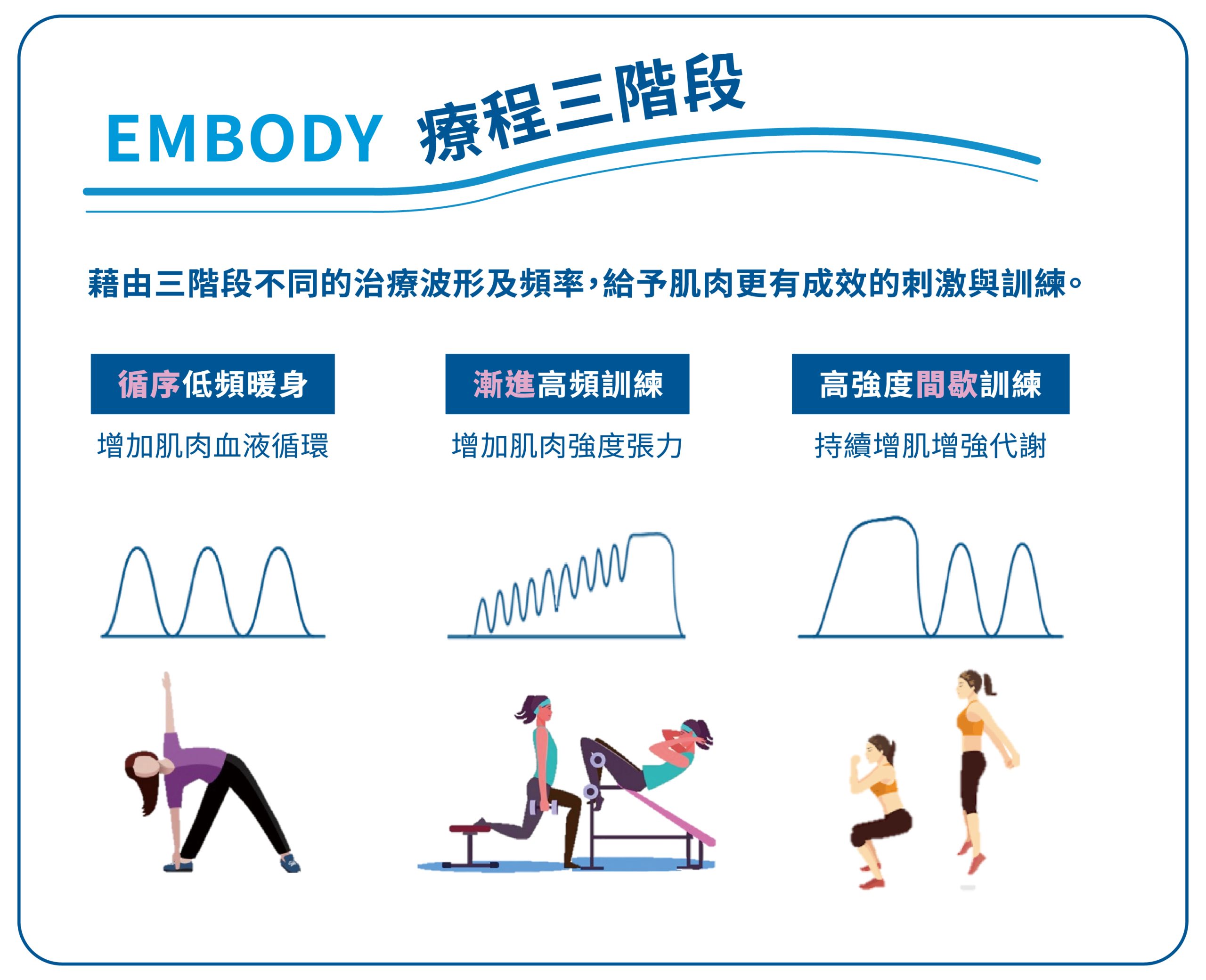 A:EMBODY 為非侵入式療程,無手術風險。常見副反應為短期的肌肉痠痛或疲倦。禁忌者需由醫師評估是否適合。