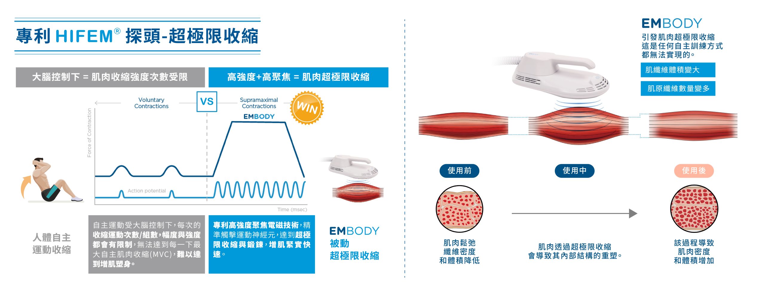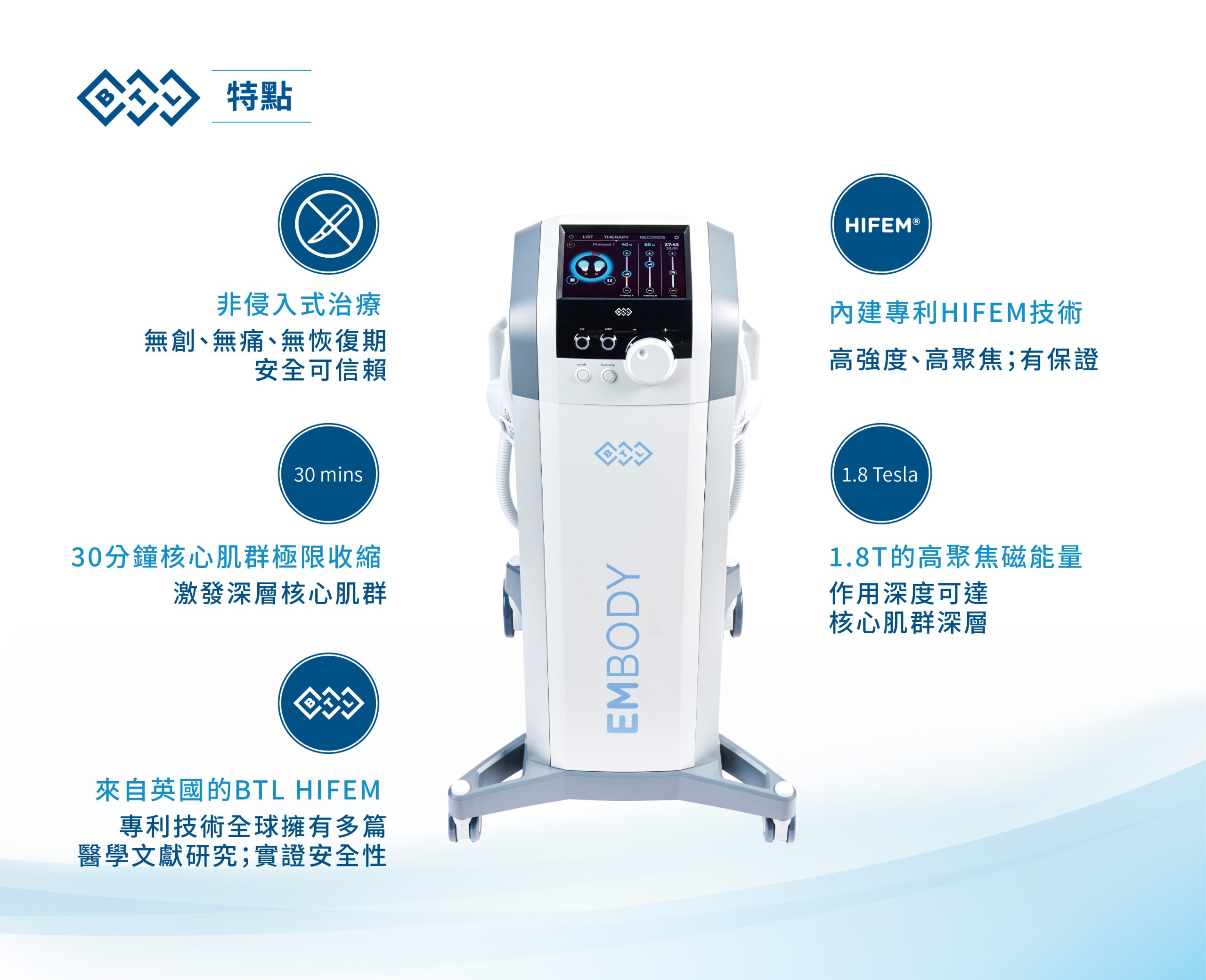 EMBODY 為英國 BTL 公司研發的非侵入式體雕儀器,採用專利 HIFEM® (High‐Intensity Focused Electromagnetic,高強度聚焦電磁) 技術,輸出穩定且強度高的磁場能量;這些能量可深入至深層肌肉(例如腹肌、臀肌等),誘發「被動肌肉收縮」,其強度與頻率遠高於一般自主運動能達到的水平。
