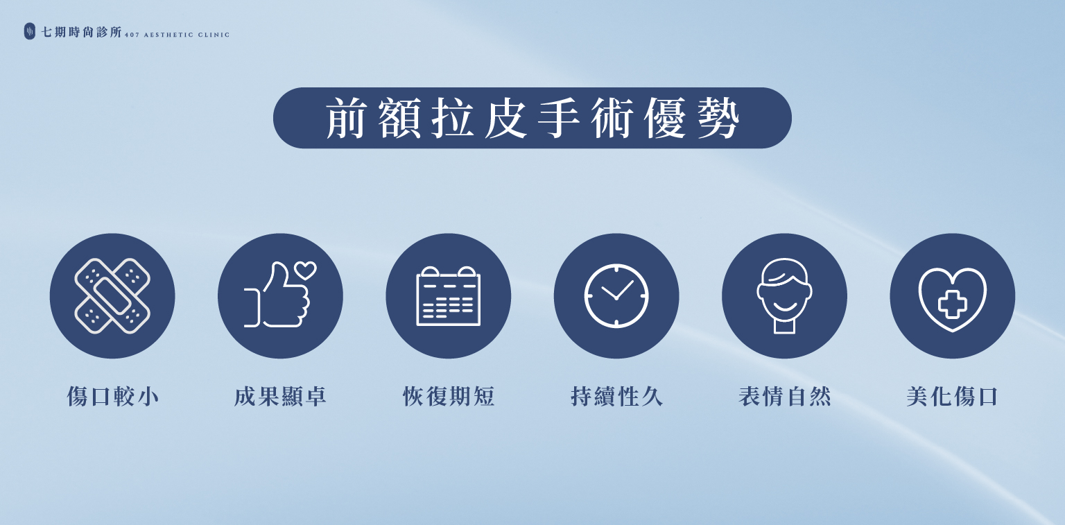 | 傳統前額拉皮 | 傳統需一圈環狀長切口 (約 20–30 公分) | 以縫線或筋膜拉提 | 疤痕較明顯,可能影響髮線或頭皮供血 | 適用於皮膚非常鬆弛者 | 恢復期長、風險較高 |