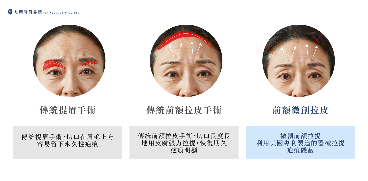 | 傳統提眉術 | 切口在眉毛上或下方 | 縫線固定 | 恐留下眉部明顯疤痕 | 適合小幅提眉或眼部微整族群 | 不易處理額頭皮膚鬆弛範圍較廣的情況 |