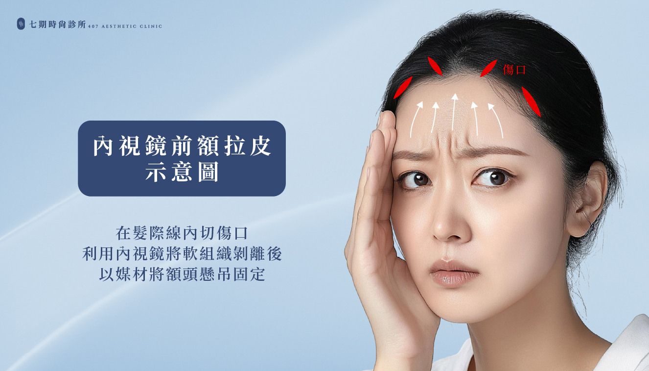 | 內視鏡前額拉皮 (微創前額拉皮) | 髮際線內 3–5 個小切口 | 縫線、骨釘或可吸收固定器 | 疤痕隱蔽於髮際線,髮線變動小 | 適合中等鬆弛者 | 對非常鬆弛者拉提幅度局限 |