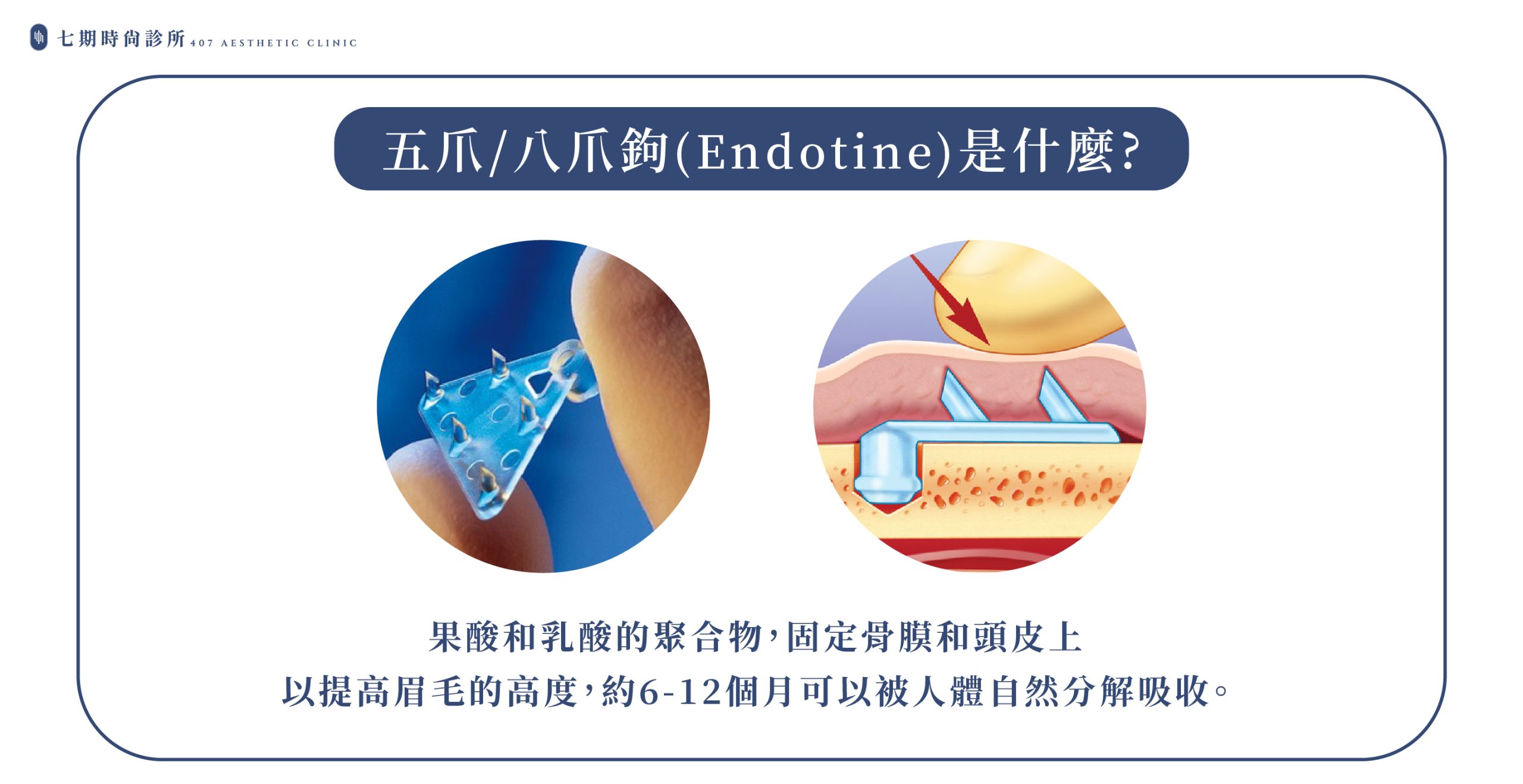 | 五爪拉皮 | 上臉區域(眉眼為主) | Endotine 五爪固定器 | 眉眼下垂、上眼皮鬆弛 | 約 5~7 天 | 約 5~8 年 |