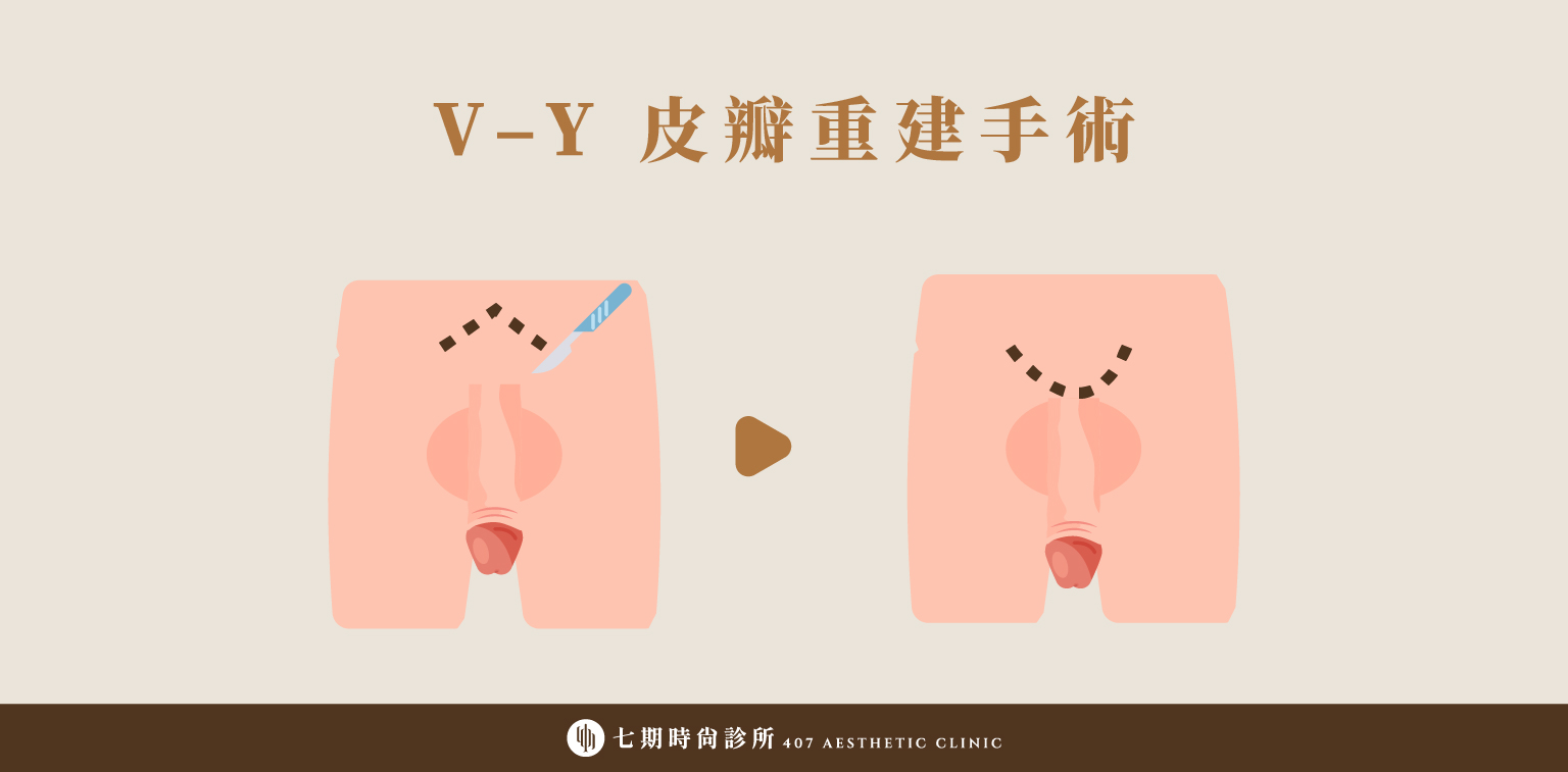 V–Y 皮瓣重建屬於皮膚與軟組織重新配置的手術方式。手術會於恥骨附近設計 V 字型切口,經分離陰莖海綿體與恥骨間的組織後,重新縫合皮膚與軟組織,術後切口外觀呈現 Y 字型。