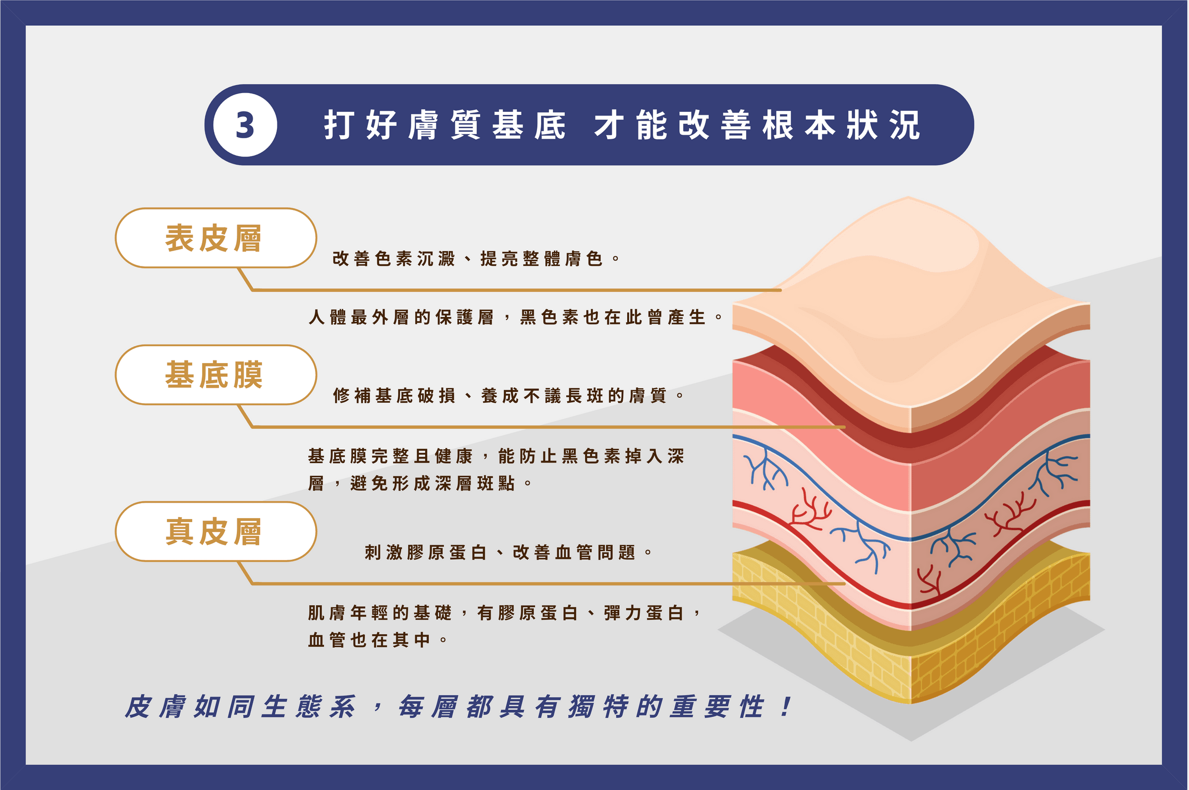 隨著年齡增長與紫外線累積,基底膜出現破損,使表皮層色素下沉至真皮層,造成長期色素沉澱。
