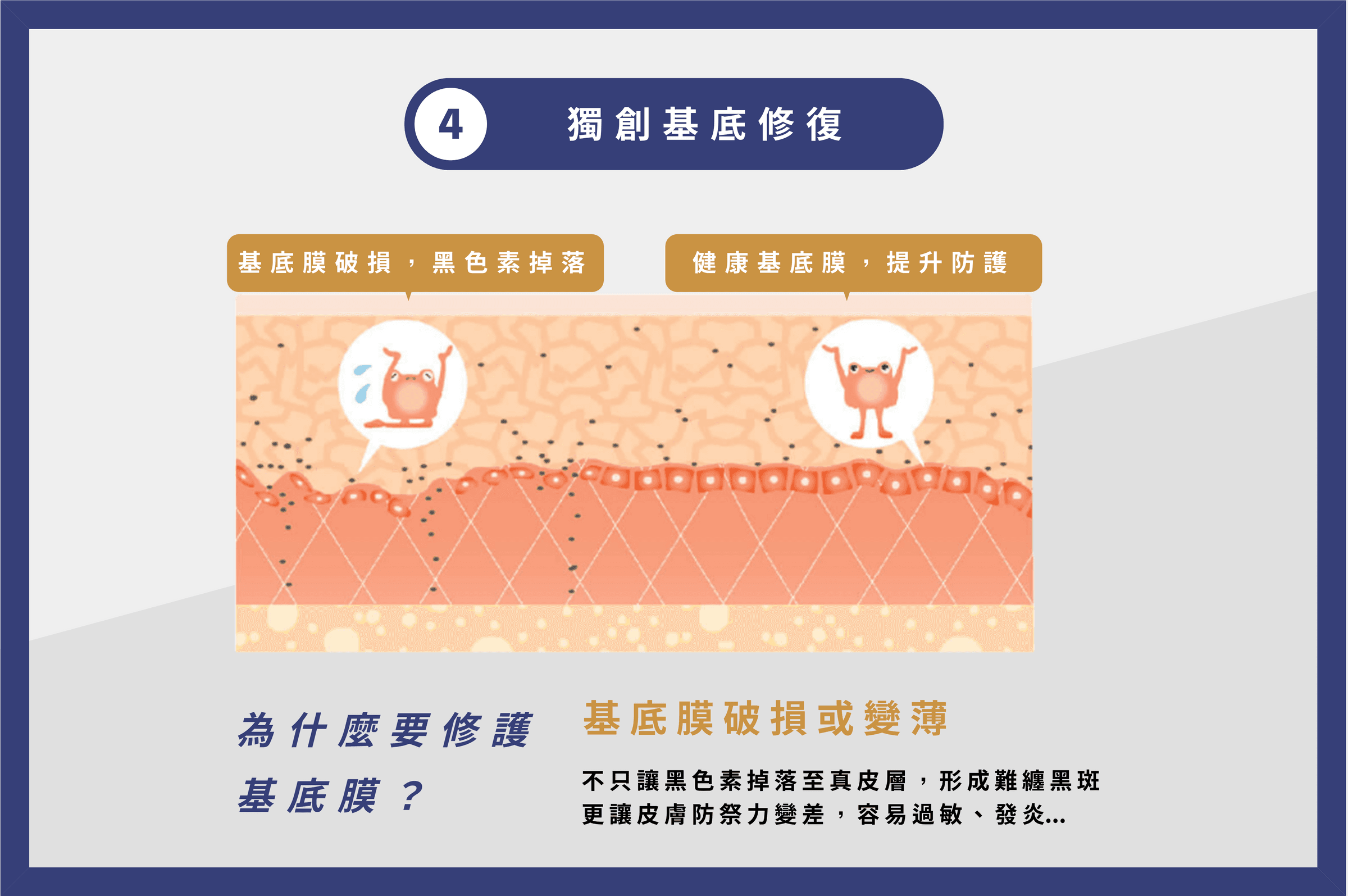 要打造不易長斑的肌膚,需要從皮膚基底層開始進行全面性的養護。除了改善皮膚表層「看得見」的問題,還必須處理皮膚深層「看不見」的狀況,例如修復基底膜、抵抗皮膚光老化,並抑制血管增生等問題。只有這樣,才能真正讓皮膚回復健康,重現年輕狀態。
