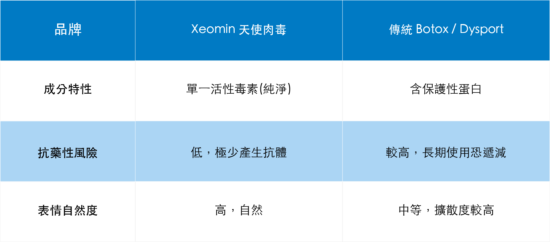● 降低效能遞減風險:傳統肉毒中的雜質可能誘發抗體,導致衰退;Xeomin 的純淨配方可避免此問題。